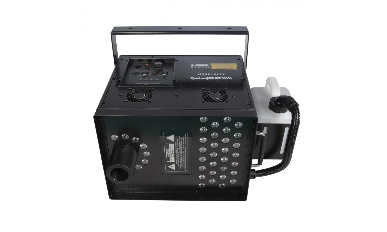 Die ZZJET35SH ist eine leistungsstarke Nebelmaschine mit vertikalem und horizontalem Ausstoß, die Rauchsäulen von über 12 Metern Höhe erzeugen kann. Sie ist die ideale Alternative zu CO2-Jet-Effekten und bietet eine spektakuläre Lösung für Events und Shows. Die erzeugte Rauchsäule wird durch zwei unabhängig steuerbare LED-Sektionen (39x8W RGB) beleuchtet, was einen extremen visuellen Eindruck garantiert.