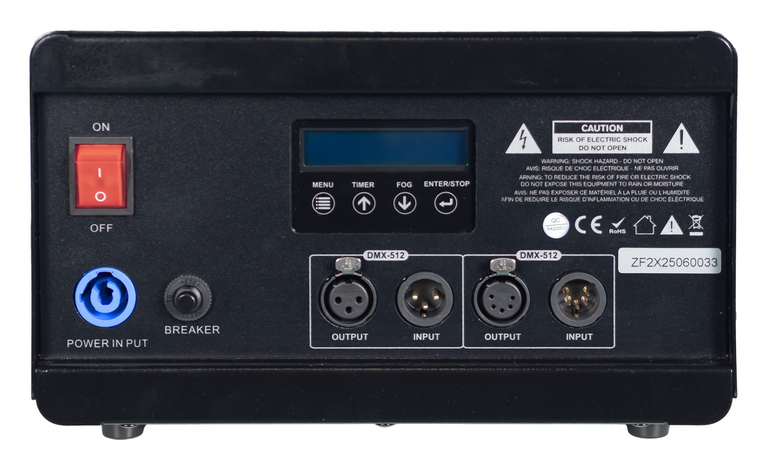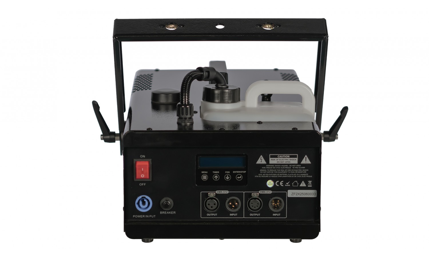 Die Maschine ist mit 3- und 5-poligen XLR-Anschlüssen für maximale Kompatibilität sowie einem PowerCON TRUE-Eingang ausgestattet. Der beleuchtete Netzschalter ermöglicht eine einfache Identifikation, und der Fluidtank besitzt eine Füllstandsanzeige mit klarer Warnung, wenn der Tank leer ist.