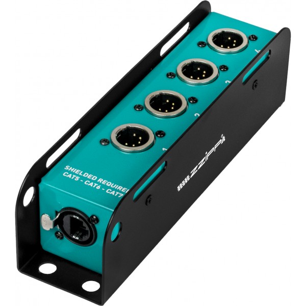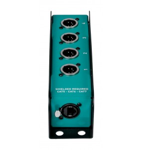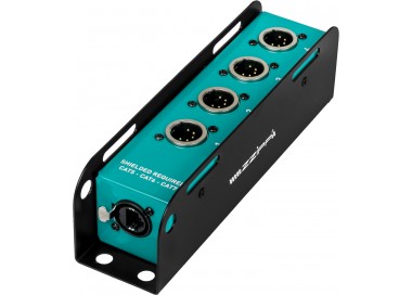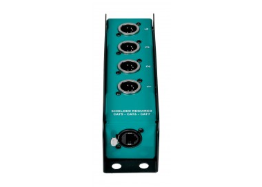Caja de cables analógica con conectores XLR de 4 canales y 5 pines, diseñada para la distribución fiable de señales DMX. El resistente chasis metálico garantiza una excelente protección electromagnética y mecánica, mientras que el cableado interno asegura la continuidad de la señal y una larga vida útil. Su formato compacto facilita un cableado ordenado, reduce el espacio en el escenario o en el rack y está disponible en varias configuraciones para satisfacer necesidades específicas de enrutamiento.
