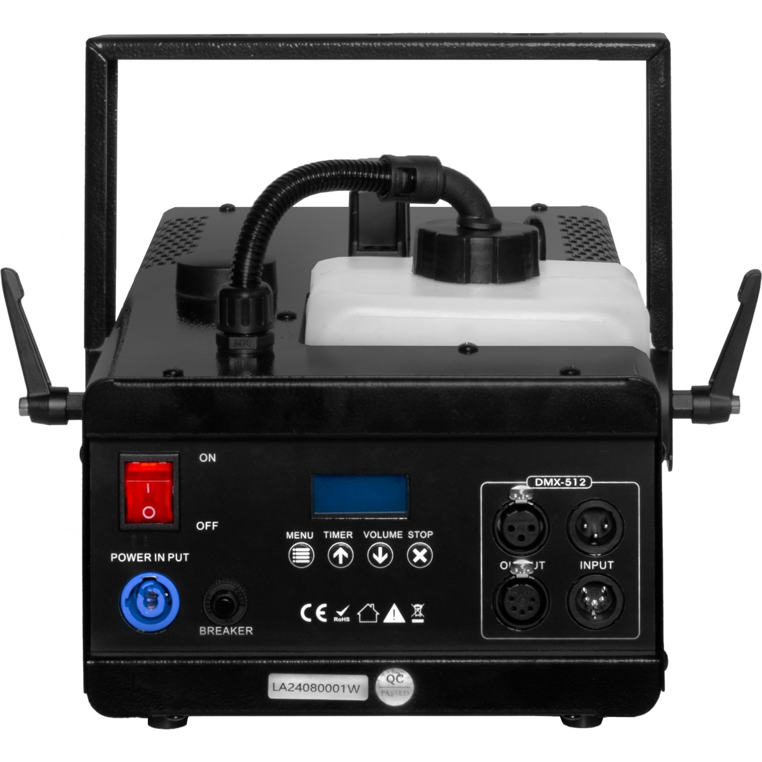 La máquina está equipada con conectores XLR de 3 y 5 pines para garantizar la máxima compatibilidad y con entrada PowerCON TRUE. El interruptor de encendido está iluminado para facilitar su localización, y el depósito de fluido dispone de control de nivel con una clara indicación cuando el depósito está vacío.