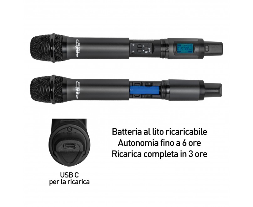 Le récepteur UHF, équipé d'un écran LED, est complété par des émetteurs avec un écran LCD et une fonction IR pour un appairage immédiat. Le port USB frontal permet la recharge directe des batteries, rendant l'ensemble du système pratique et prêt à l'emploi. Les microphones portables, dotés d'une capsule dynamique unidirectionnelle et d'une batterie au rechargeable, garantissent un son clair et précis même dans des conditions difficiles.