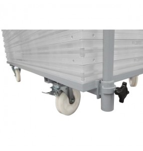Set composto da quattro adattatori rinforzati di acciaio dotati di ruote di nylon girevoli con freno (Ø 100 mm, RDA-02) adattabili ai piedi telescopici della pedana TM442XL.