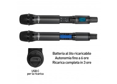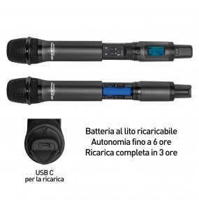 The UHF receiver, equipped with an LED display, is complemented by transmitters with an LCD display and IR function for immediate pairing. The front USB port allows direct battery charging, making the entire system practical and ready for use. The handheld and bodypack transmitters, equipped with a unidirectional dynamic capsule and a rechargeable battery, ensure a clear and precise sound even in difficult conditions.